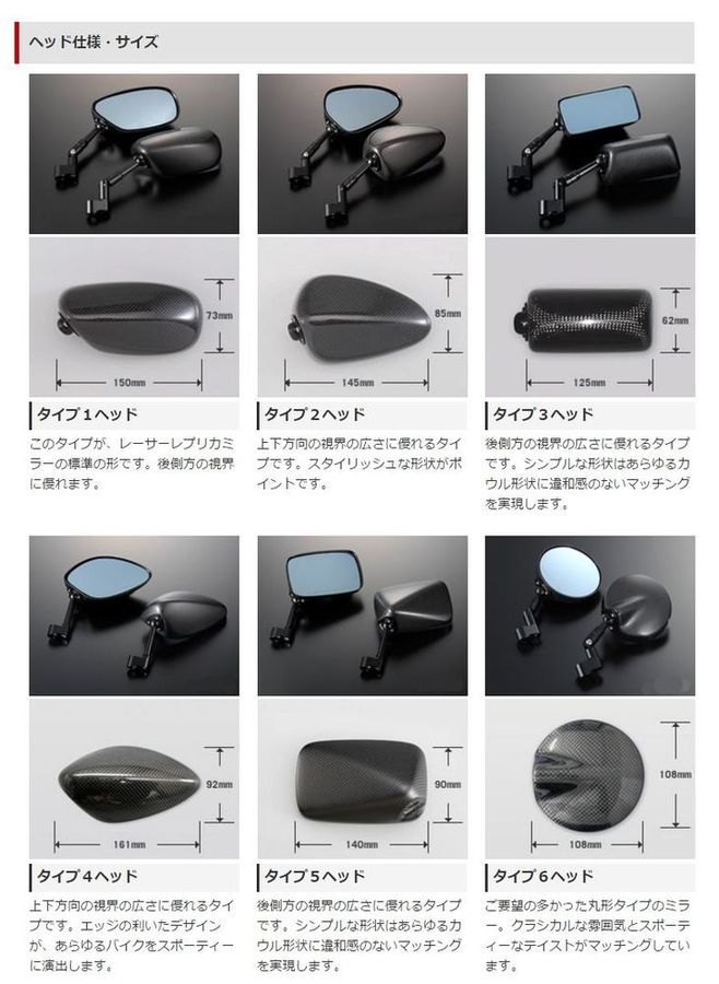 種類は6種類あり、バイクの形状や取り付け位置によってお好みのタイプを選択することが可能です。