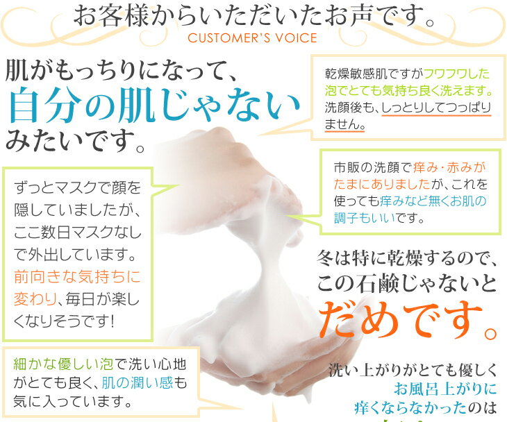 <無香料・無着色・アルコール(エタノール)フリー> 全成分 カリ含有石ケン素地/DPG/水/グリセリン/スクロース/ソルビトール/ポリグルタミン酸/マカデミア種子油/グリチルリチン酸2K/セレブロシド/コンフリー葉エキス/ビワ葉エキス/ハッカ枝/葉エキス/トウキ根エキス/センキュウ根茎エキス/ハトムギ種子エキス/ヨーグルト液(牛乳)/マンダリンオレンジ果皮エキス/クリサンテルムインジクムエキス/ヒメフウロエキス/ボタンエキス/ワイルドタイムエキス/セラミドAP/PCA-Na/フィトステロールズ/グルコシルセラミド/ステアロイルグルタミン酸2Na/エチドロン酸4Na/BG ご使用方法 軽くお肌をぬらした後、石けんに水かぬるま湯を加え、手のひらでしっかりあわ立てます。