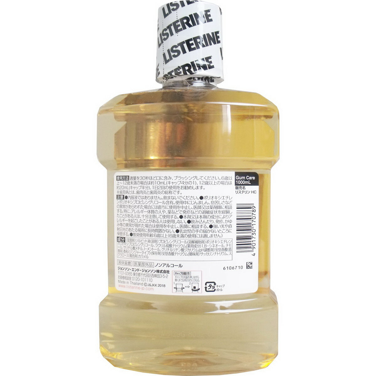 サイズ・容量 個装サイズ:112X225X78mm個装重量:約1123g内容量:1000mLケースサイズ:24.8X24.6X24.0cmケース重量:約7.1kg製造国:タイ区分 医薬部外品販売元:ジョンソン・エンド・ジョンソン 商品説明 【成分】(湿潤剤)ソルビット液(溶剤)プロピレングリコール(溶解補助剤)ポリオキシエチレンポリオキシプロピレングリコール、ラウリル硫酸ナトリウム(薬用成分)1.8-シネオール、チモール、サリチル酸メチル、L-メントール、グリチルリチン酸ジカリウム(pH調整剤)安息香酸(着香剤)香料(ジンジャータイプ)(保存剤)安息香酸ナトリウム(矯味剤)サッカリンナトリウム、スクラロース(着色剤)カラメル【使用方法】適量を30秒ほど口に含み、ブラッシングしてください。