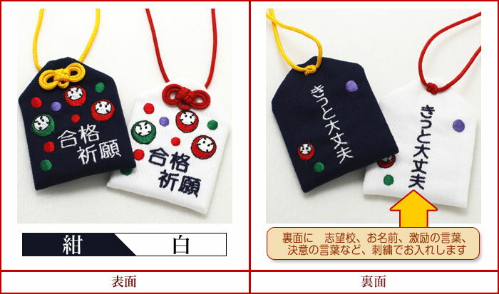 ギフト対応のアイコンについて サイズ 【通常サイズ】 縦7cm 横5cm ひも15cm 生地素材 綿ツイル(綿100%) 表面 『合格祈願』まん丸だるま 裏面 志望校、激励の言葉など、ご希望の文字を刺繍でお入れします 10文字程度以内 (1列5文字 2列程度) ※文字の書体は丸ゴシック(文字の色、書体を変更ご希望の場合はお気軽にお申し付けください) ひもオプション (+100円) ・首かけ用長ひも(45cm) 納期 受注後1週間程度での発送お急ぎの場合はご相談ください。